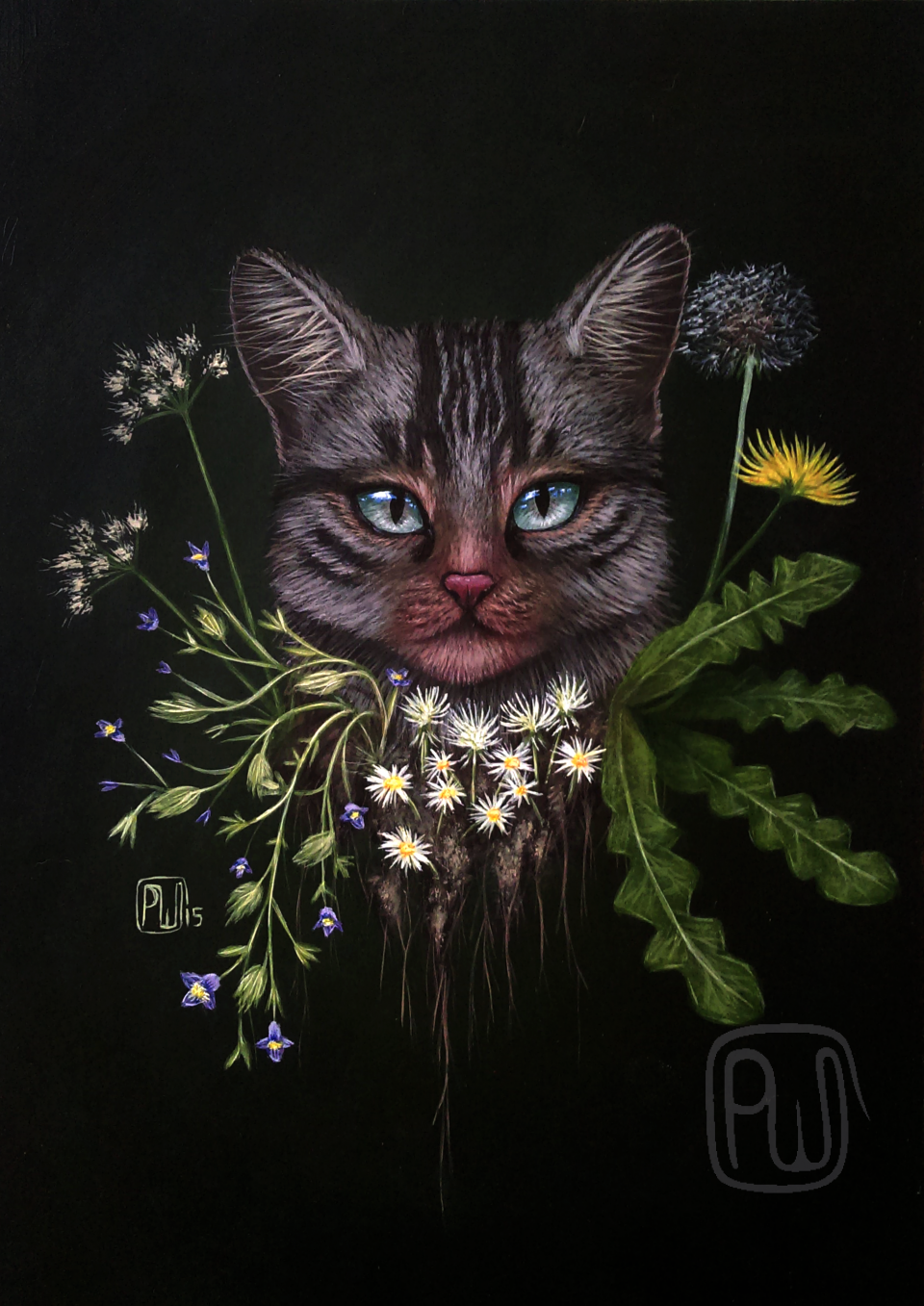 Grow-a-catPainted on tempered hardboard. $800.002015For SaleWidth: 21.00cmHeight: 30.00cmFraming: Framedweedsscottishwildcat